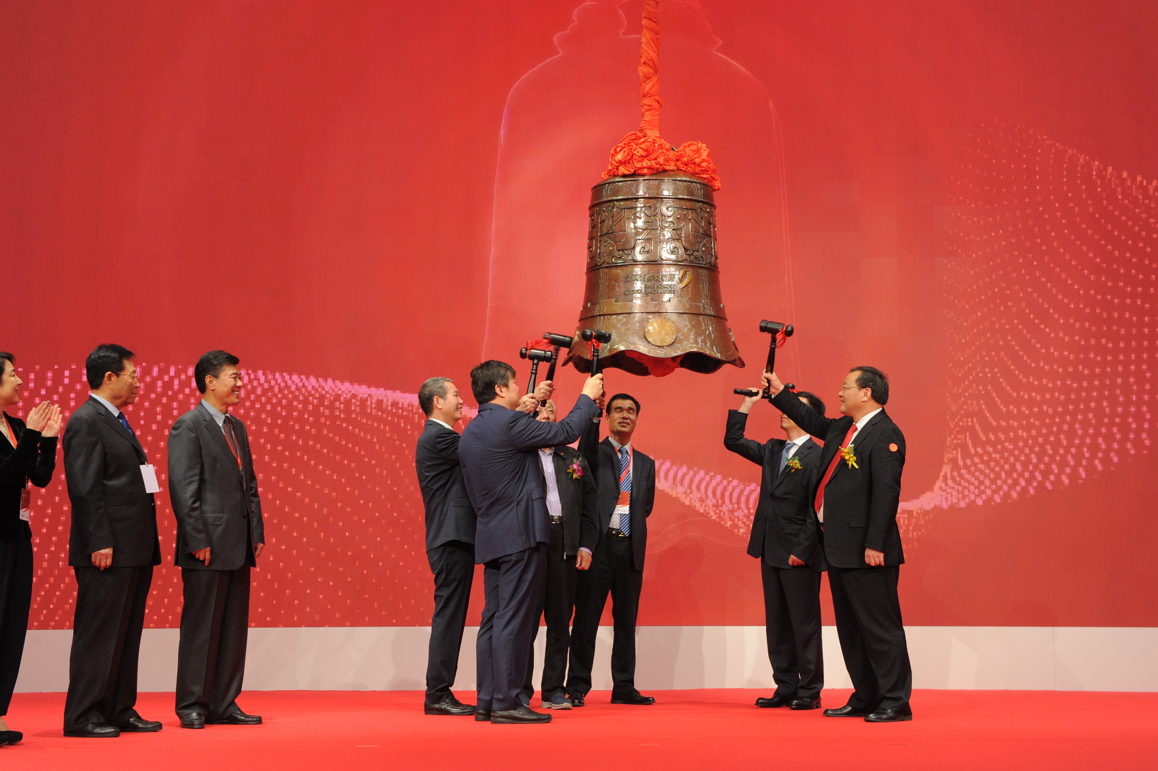 深圳市容大感光科技股份有限公司董事長林海望先生及中國印制電路析協(xié)會名譽(yù)秘書長(三毛扮演者)王龍基先生一起敲響開市寶鐘