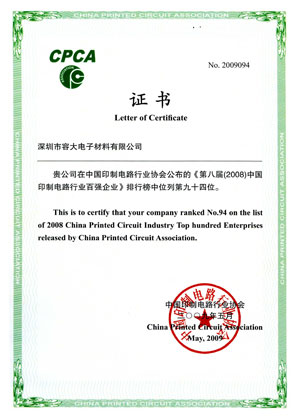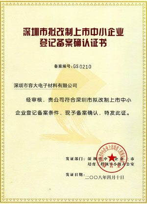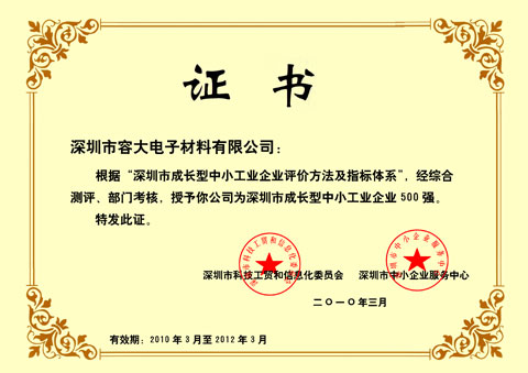 2010年 創(chuàng)建吳江市容大電子材料有限公司 獲得榮譽:國家級高新技術(shù)企業(yè) 深圳市擬改制上市中小企業(yè) 中國印制電路行業(yè)百強企業(yè) “雙愛雙評”先進企業(yè)